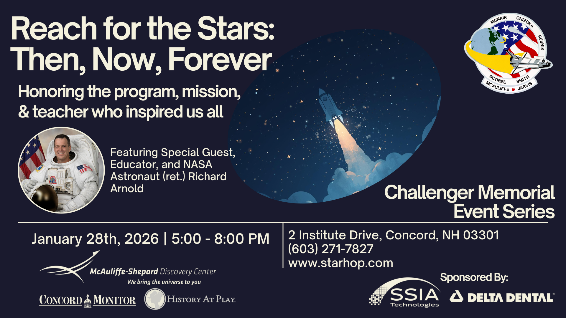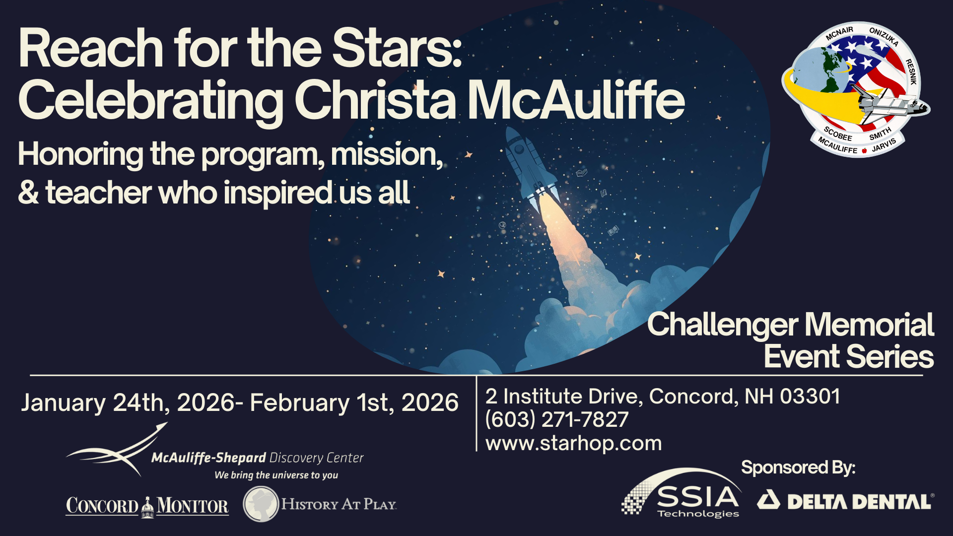 For many, it's impossible to believe that it's been 40 years since the Challenger Disaster, and some have only heard pieces of the story because they weren't born yet. Regardless of where you were on January 28th, 1986, we invite you to join us as we remember the Teacher in Space Project, honor the SLS-51L crew, and celebrate the life and legacy of New Hampshire's own, Christa McAuliffe.