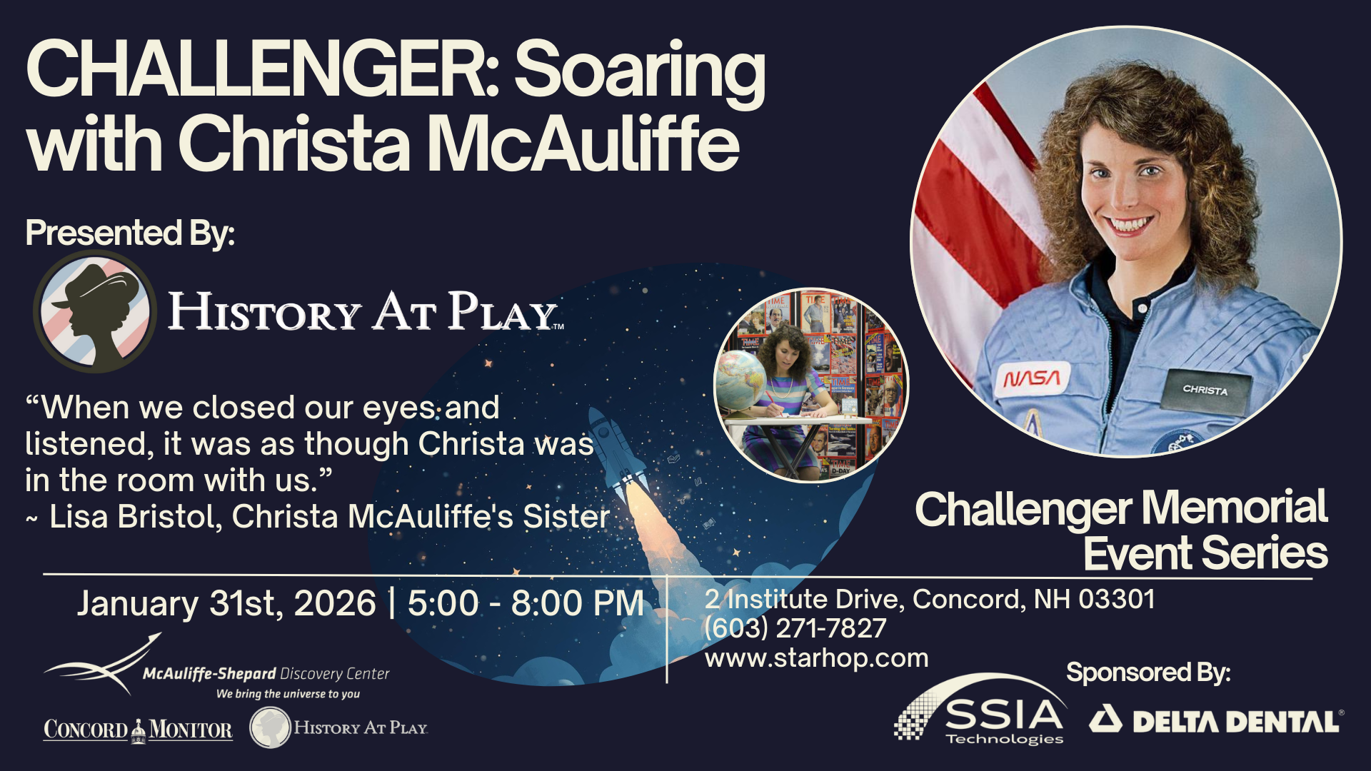 History At Play™, LLC (HAP) has garnered nationwide acclaim for their Immersive Living History Experiences, chronicling the lives of legendary figures who changed society. Their performances have received accolades from journalists, actors, and historians alike and have earned statewide and national recognition. Now, the acclaimed solo performance, “CHALLENGER: Soaring with Christa McAuliffe™,” will be performed at 5:00 pm, Saturday, January 31st, 2026 at the Discovery Center.